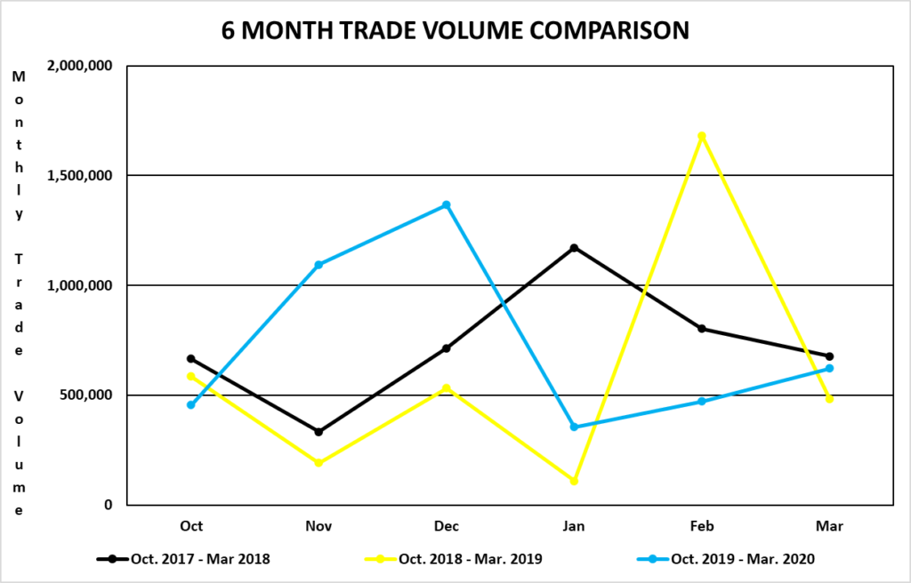 Trading volume for the three-month period January 2, 2020 to March 31, 2020 was 1,450,402 shares for a value of $7,859,910.56. By comparison, trading volume for the three-month period January 2, 2019 to March 29, 2019 was 2,272,970 shares for a value of $9,788,268.57.