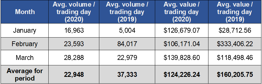 For the three-month period from January 2, 2020 to March 31, 2020, the average volume per trading day was 22,948 shares for a value of $124,226.24. By comparison, for the three-month period from January 2, 2019 to March 31, 2019, the average volume per trading day was 37,333 shares for a value of $160,205.75.