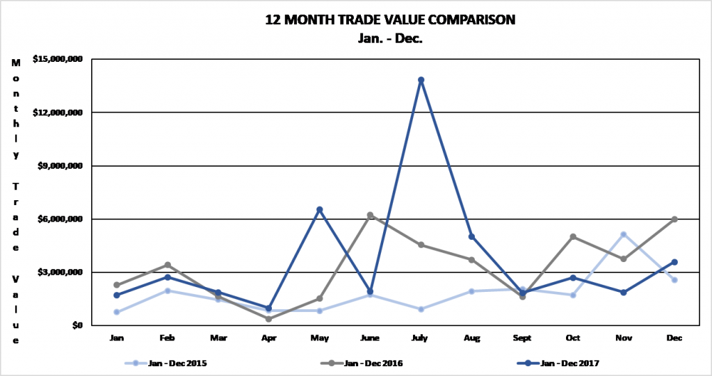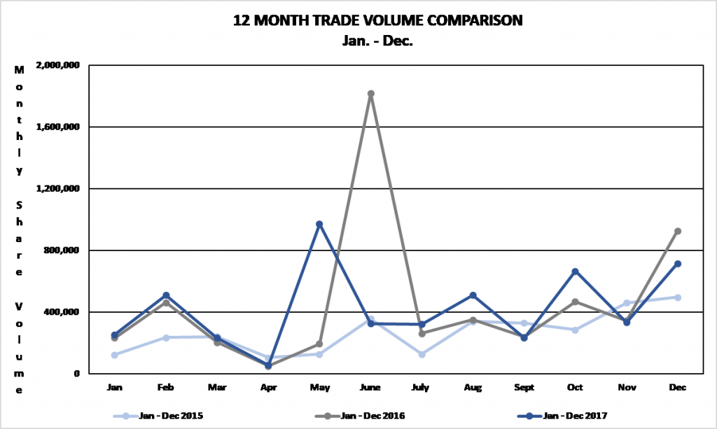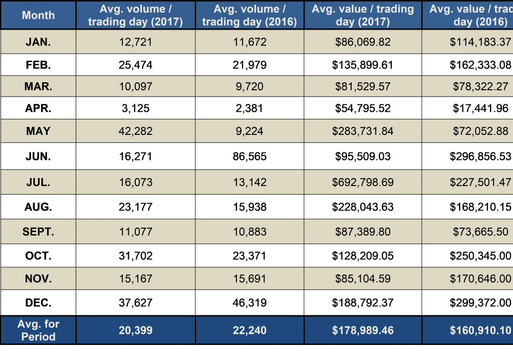 TRADING VOLUMES AND VALUESTrading volume for the twelve-month period January 1, 2017 to December 29, 2017 was 5,128,595 shares for a value of $44,596,767. Trading volume for the twelve-month period January 1, 2016 to December 30, 2016 was 5,552,593 shares for a value of $40,070,454.82. Trading volume for the three-month period October 1 to December 29, 2017 was 1,714,335 shares for a value of $8,151,746. By comparison, for the three-month period from October 1 to December 30, 2016 was 1,738,991 shares for a value of $14,748,550.66.