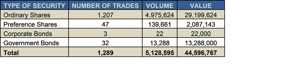 As at December 29, 2017 the market was comprised of 20 ordinary shares with a market capitalization of $4.43 Billion. In addition, there were 13 preference shares with a market capitalization of $327 Million and 19 bonds with a face value of $579 Million.