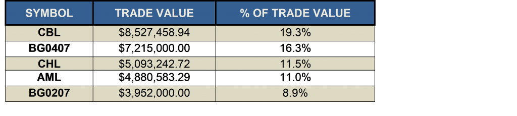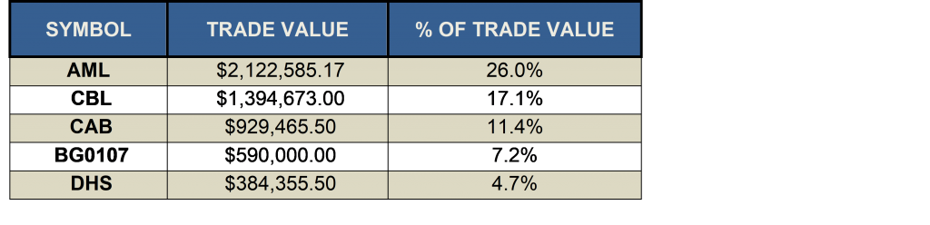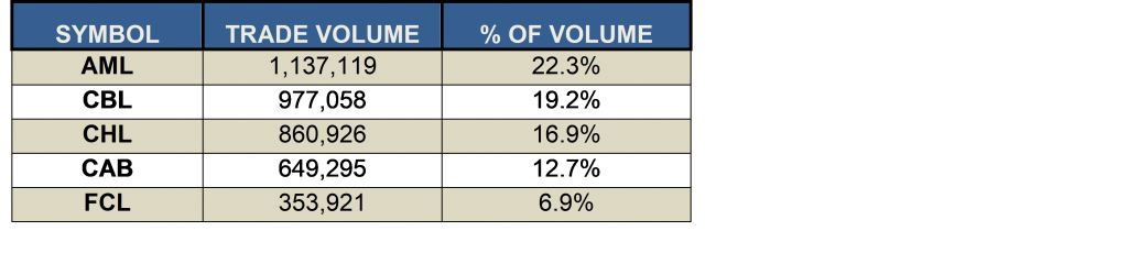 SHARE VOLUME AND VALUE LEADERS (TWELVE MONTH PERIOD)The top five share volume leaders on BISX for the twelve-month period January 1, 2017 to December 29, 2017 with their contribution to total traded volume displayed as a percentage were: