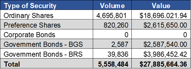 As at December 31, 2020 the market was comprised of 20 ordinary shares with a market capitalization of $4.51 Billion. In addition, there were 7 preference shares with a market capitalization of $244 Million, 10 BGS and corporate bonds with a face value of $479 Million, and 210 BRS with a face value of $3.5 billion.