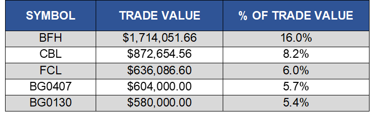 The top five share volume leaders on BISX for the three-month period October 1, 2020 to December 31, 2020 with their contribution to total traded volume displayed as a percentage were: